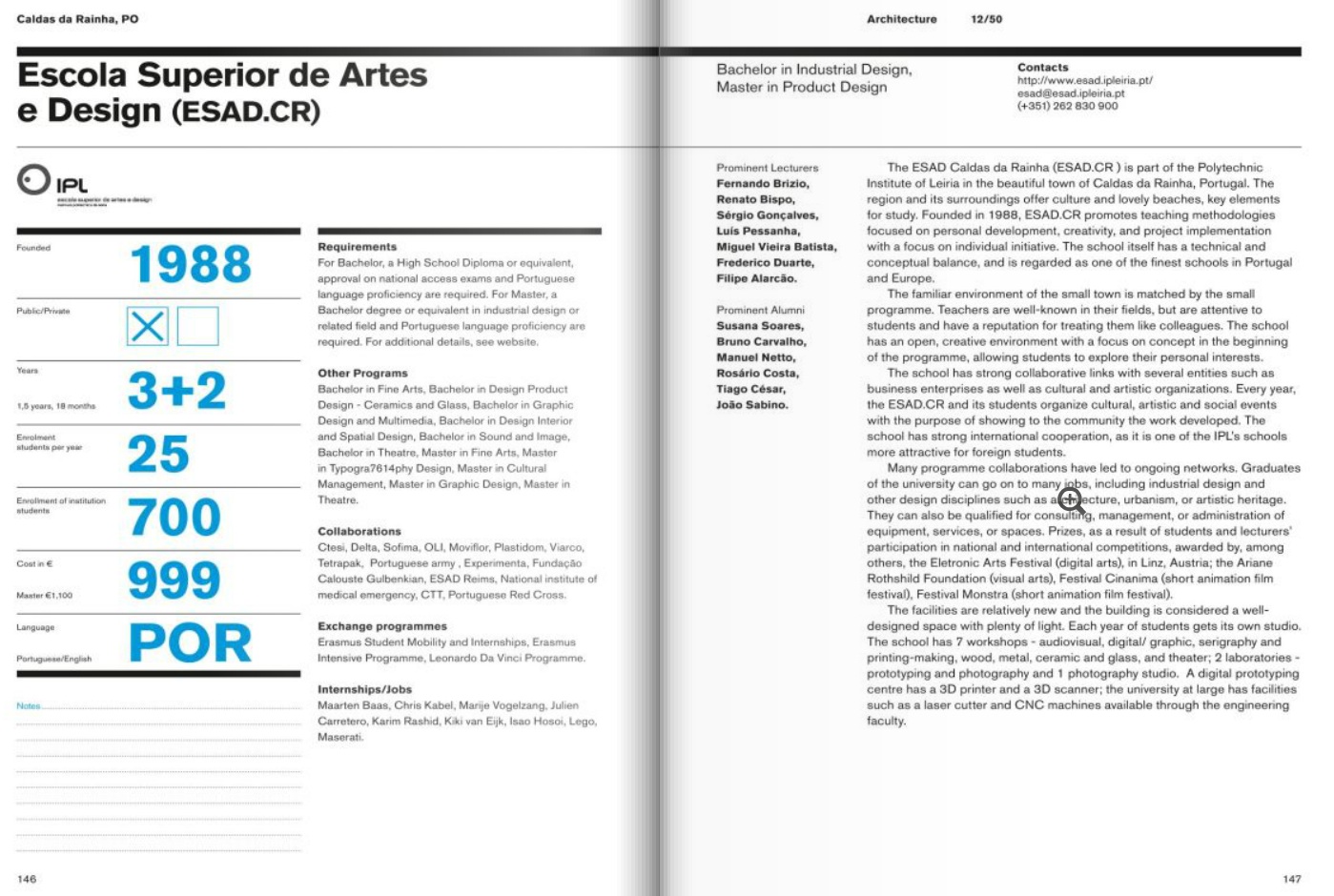 - Nessa revista aparecem apenas quatro referências a Escolas Portuguesas: a Escola Superior de Arquitectura da Universidade do Porto, a Escola Superior de Design da Universidade de Lisboa, a Escola Superior de Design da Universidade de Aveiro e a Escola Superior de Arte e Design das Caldas da Rainha;